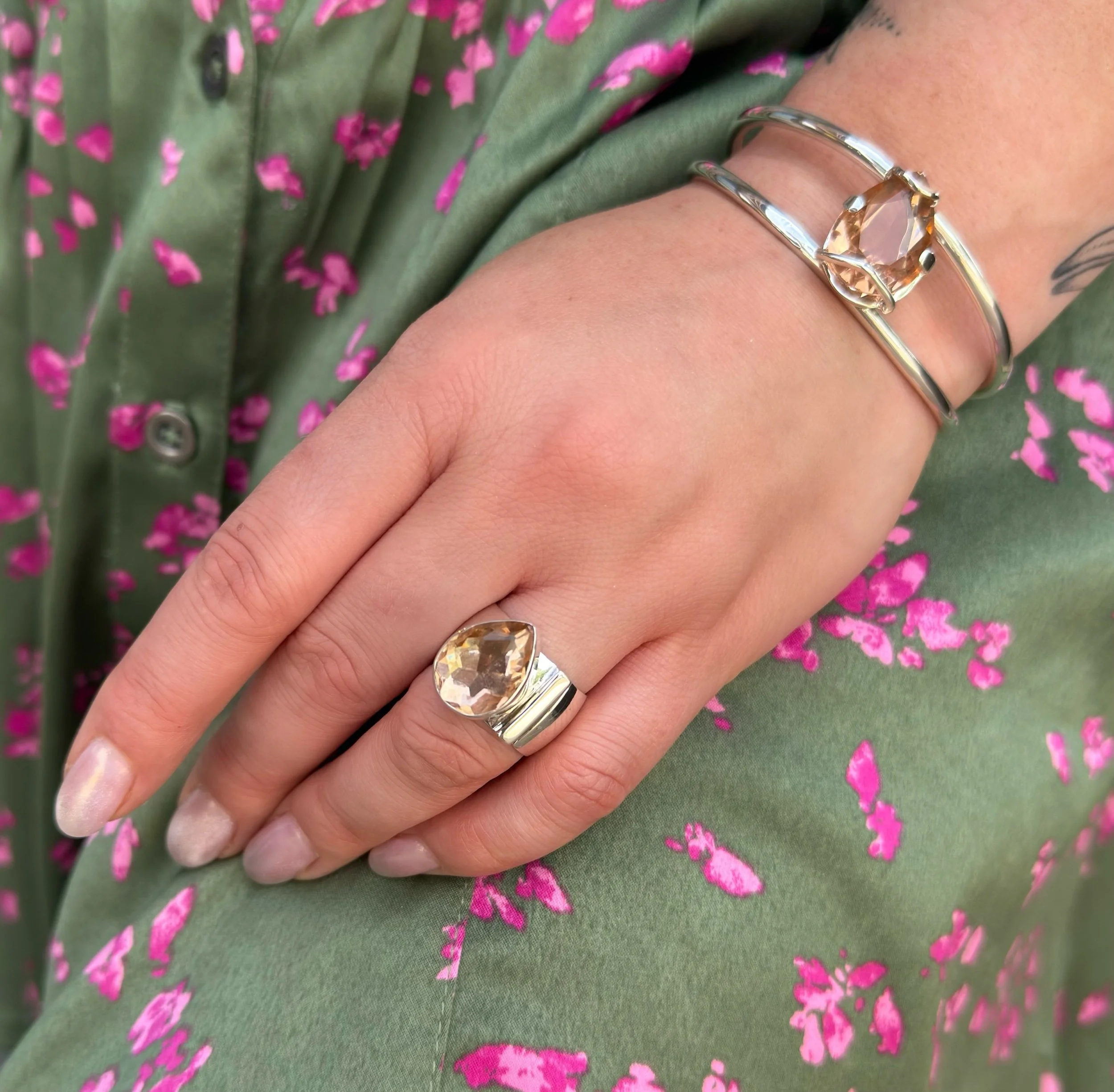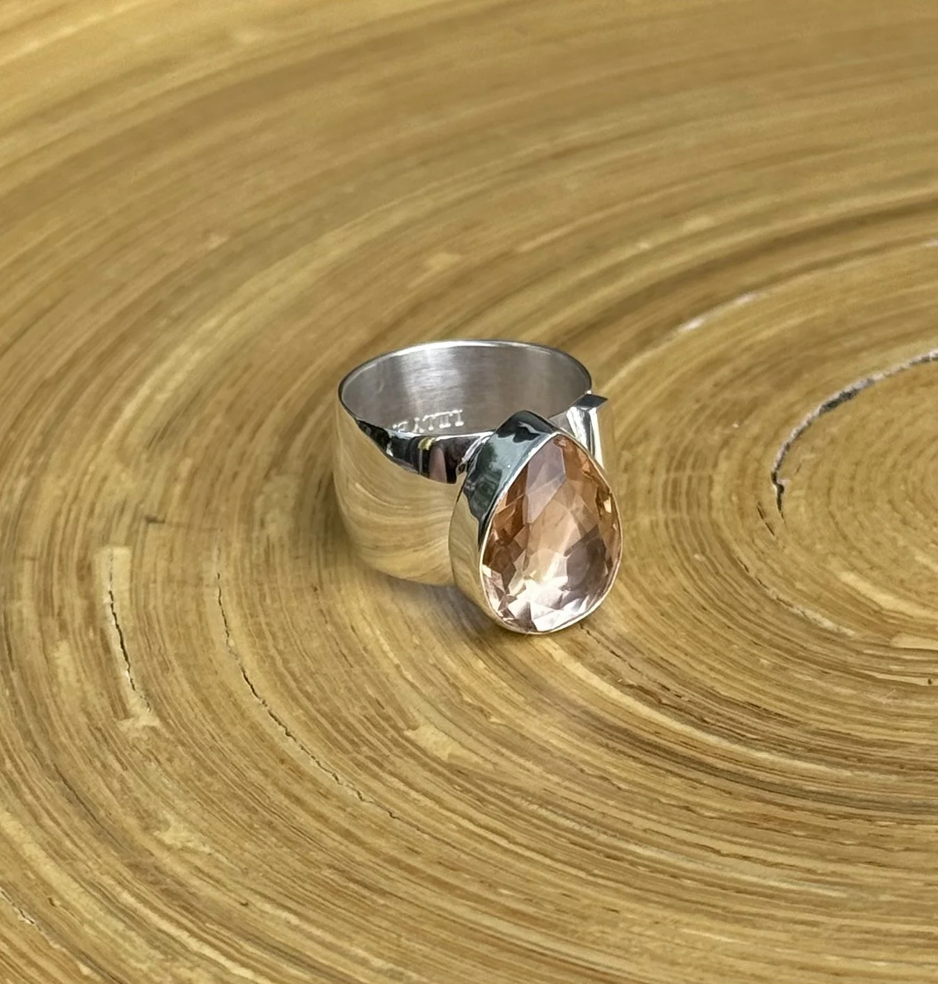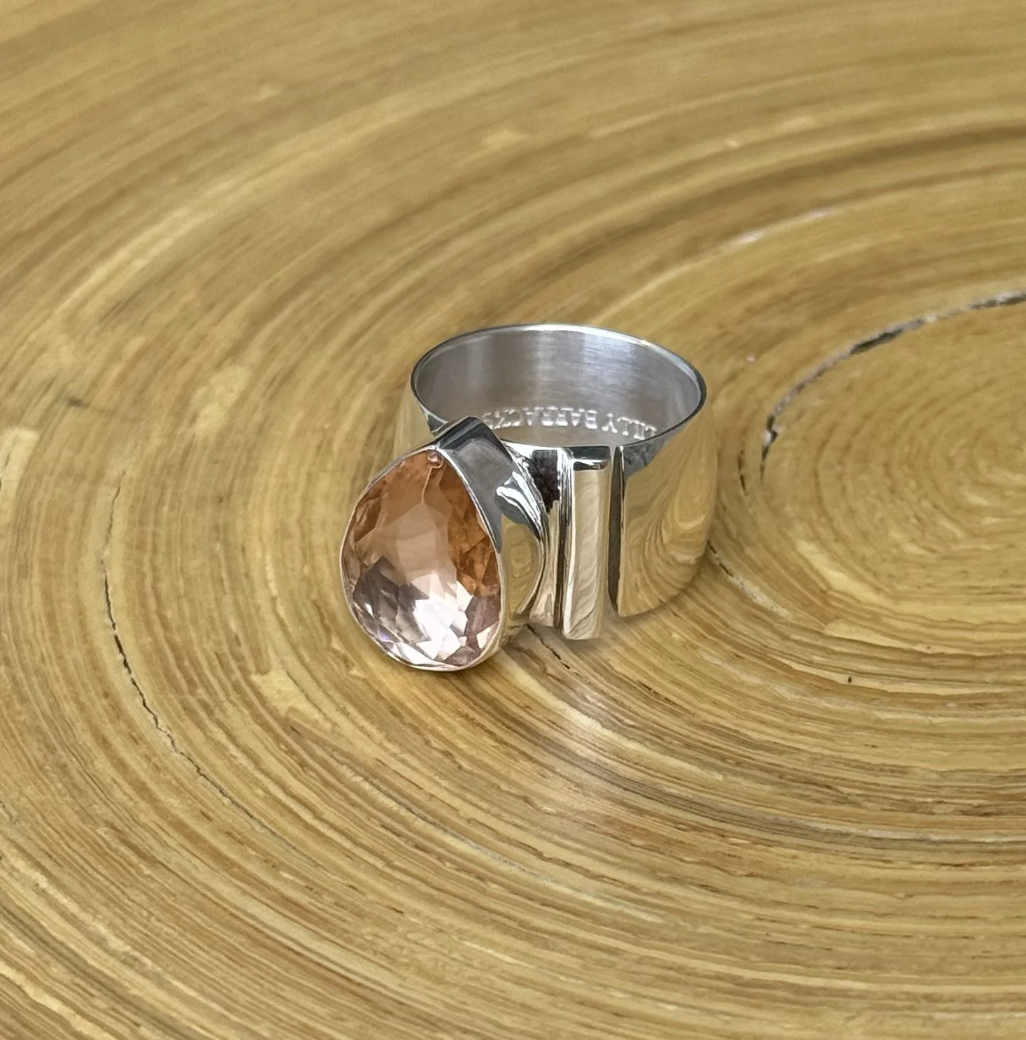 Make a statement with this truly one-of-a-kind ring, featuring a stunning faceted teardrop morganite set in one of Lilly’s most sought-after designs. Crafted from solid sterling silver, the bold cigar band showcases a distinctive asymmetrical setting, with a sleek silver bar accenting one side of the stone for a modern, eye-catching look.